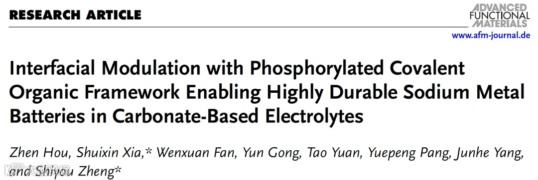 近日,来自上海理工大学的郑时有教授与夏水鑫副教授,在国际知名期刊Advanced Functional Materials上发表题为“Interfacial Modulation with Phosphorylated Covalent Organic Framework Enabling Highly Durable Sodium Metal Batteries in Carbonate-Based Electrolytes”的文章。该文章制备了一种磷酸修饰的共价有机框架材料,并将其用作人造SEI膜制备高性能钠金属负极。