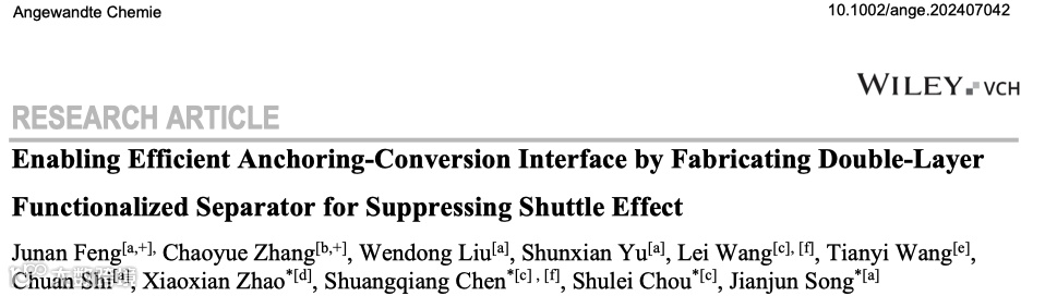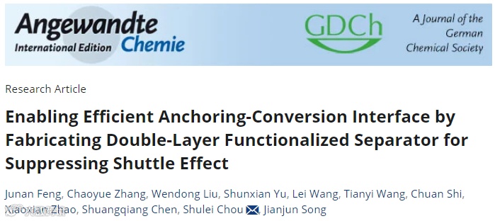 近日,青岛大学特聘教授宋建军联合温州大学的侴术雷、陈双强教授和河北农业大学的赵孝先教授在国际知名期刊Angew. Chem. Int. Ed. 期刊发表题为“Enabling Efficient Anchoring‐Conversion Interface by Fabricating Double‐Layer Functionalized Separator for Suppressing Shuttle Effect”的研究论文。研究团队提出了一种新颖的双层隔膜设计策略,利用金属Co团簇和原子分散的CoN4双活性位点修饰的科琴黑导电碳(Co/CoN4@KB)和二维MXene纳米片(MX)确保了多硫化物的高效吸附-催化界面。Co团簇和CoN4分别对长链和短链多硫化物表现出靶向的催化-吸附能力,CoN4还能诱导充电过程中硫化锂的Li-S键断裂,从而降低硫化锂解离的活化能垒。