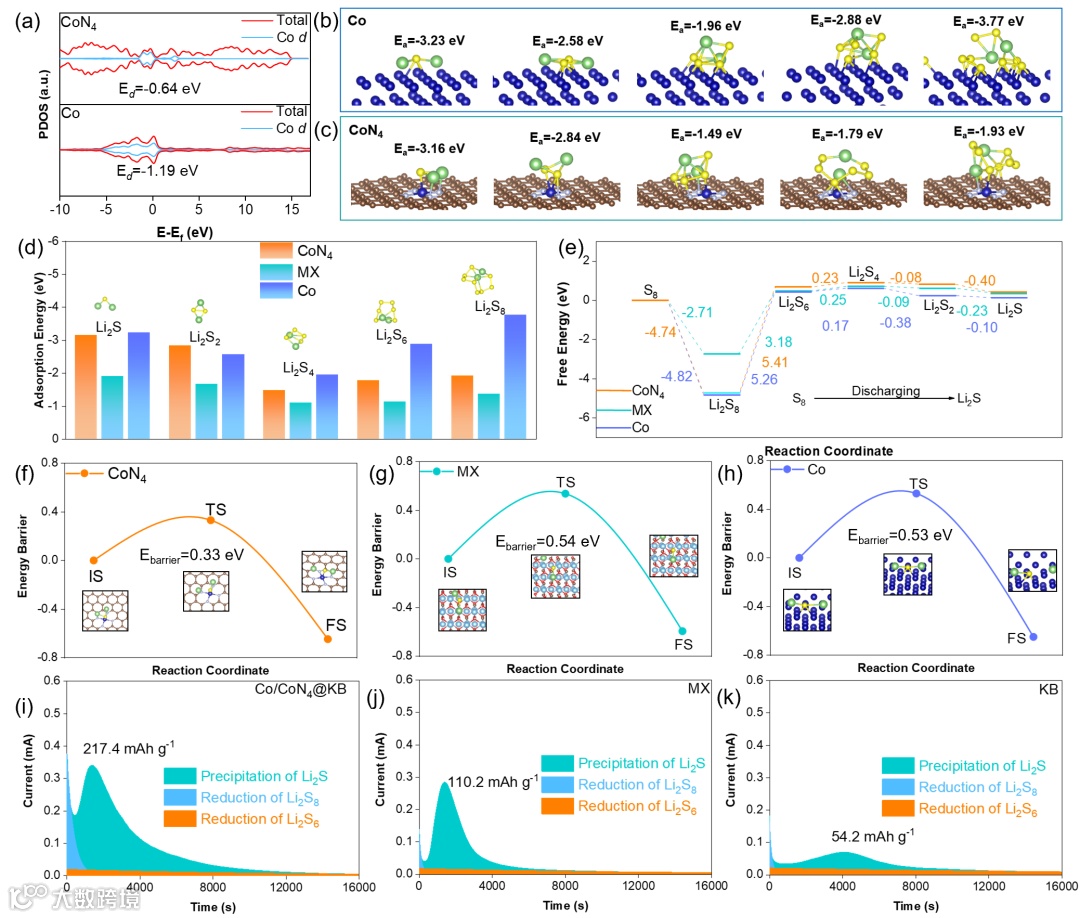 图3. (a) CoN4和金属Co的PDOS图;(b) Co和(c) CoN4与硫物种作用的俯视图和侧视图;(d) 多硫化物在CoN4、MX和Co表面上的吸附能;(e) S8还原过程中的相对吉布斯自由能;(f-h) Li2S在CoN4、MX和Co表面的氧化分解能垒;(i-k) 在2.05 V恒电位放电下的Li2S成核实验的i-t曲线。