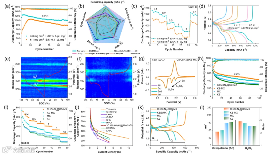 图5. (a) 使用 Co/CoN4@Kb-MX的锂硫电池在高硫负载下的循环性能;(b) 与其他已报道的MXene相关隔膜的电化学性能比较;(c) 在不同硫负载和E/S比下的倍率性能;(d) 使用Co/CoN4@KB-MX锂硫电池的充放电平台;使用PP(c)和Co/CoN4@KB-MX隔膜(f)的锂硫电池的原位拉曼光谱;(g) 用Co/CoN4-KB@MX隔膜的锂硒电池的CV曲线;(h) 锂硒电池的循环和(i) 倍率性能;(j) 与以前报道的工作的锂硒电池电化学性能比较;(k) 0.2 C下经过10个循环后的锂硒电池的充放电曲线;(l) 相应的过电位和QL/QH比。