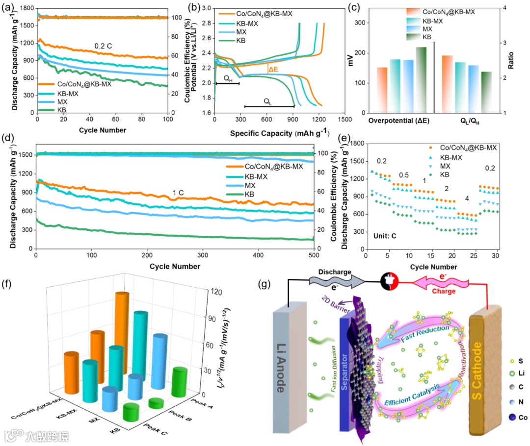 图4. (a) 0.2 C下的锂硫电池循环性能;(b) 充放电曲线;(c) 过电位和QL/QH的值;(d) 1.0 C下锂硫电池的长期循环性能;(e) 倍率性能;(f) CV峰电流与扫描速率平方根的线性拟合曲线斜率;(g) 使用Co/CoN4@KB-MX隔膜的锂硫电池示意图。