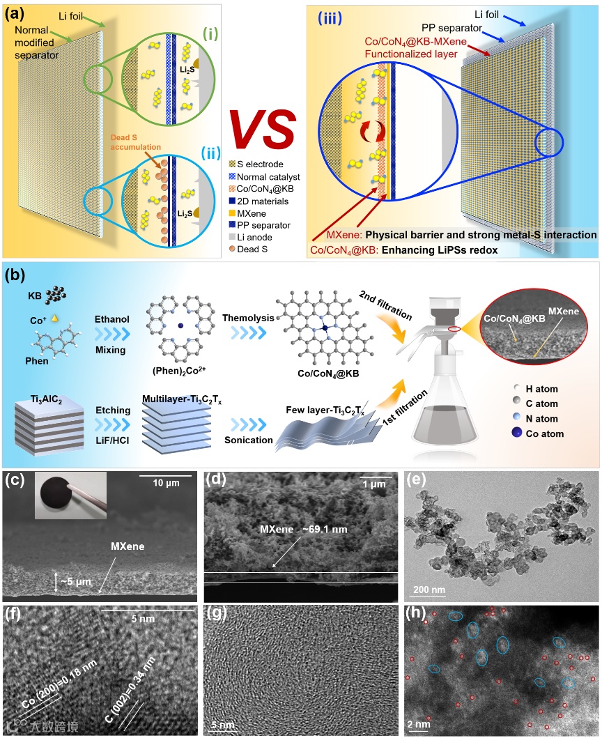 图1. (a) 在不同改性隔膜类型下硫物种和离子的行为示意图:(i)多孔导电催化剂;(ii)二维层状材料;(iii)设计的极性催化剂材料和二维材料结合的双层Co/CoN4@KB-MXene隔膜;(b) 两步抽滤合成Co/CoN4@KB-MX隔膜的示意图;(c) Co/CoN4@KB-MX的横截面SEM图像和(d) 相应的放大图像;(e) Co/CoN4@KB的TEM图像和(f, g) HR-TEM图像;(h) SAC-HAADF-STEM图像。