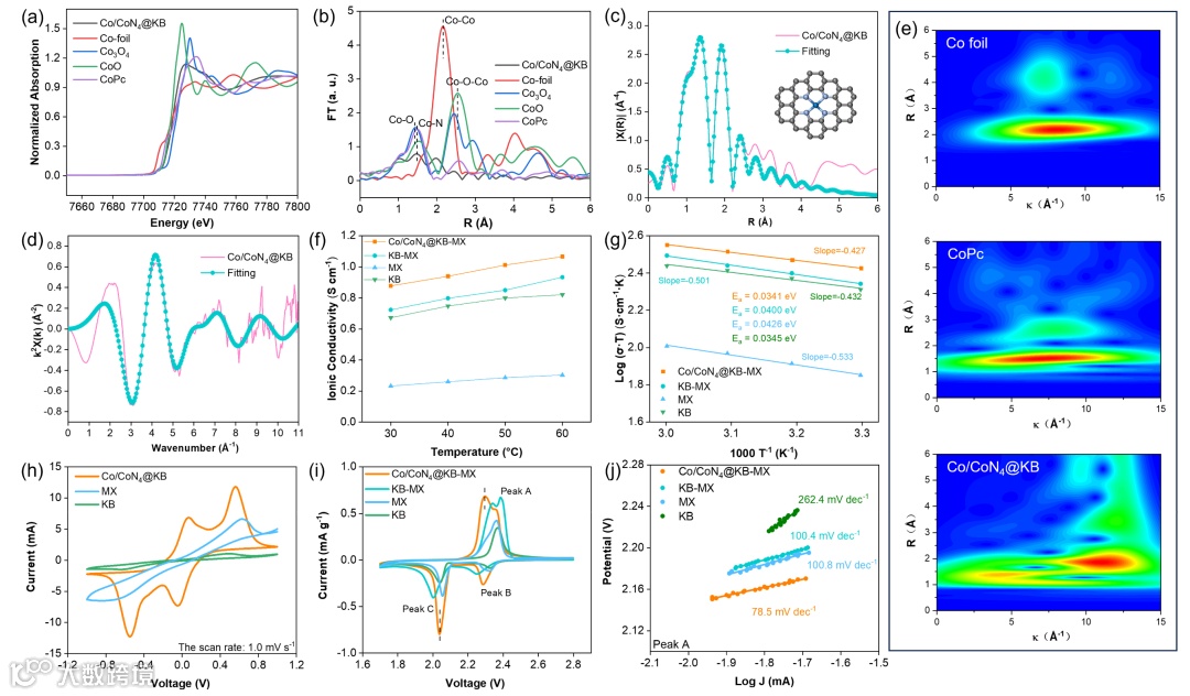 图2. (a) 不同材料的Co K边XANES光谱;(b) Co/CoN4@KB和参比样品的EXAFS谱的k2加权傅里叶变换;(c, d) Co/CoN4@KB EXAFS的 R(c)和K(d)空间拟合曲线;(e) Co箔、CoPc和Co/CoN4@KB的Co K边小波变换 (WT) EXAFS;不同隔膜的(f) 离子电导率和(g) 活化能;对称电池 (h)和锂硫电池 (i)在1 mV/s下的CV曲线;(j) Co/CoN4@KB-MX及其对照样品的循环伏安曲线中A峰的Tafel斜率。
