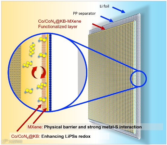 硫物种在Co/CoN4@KB-MX隔膜上的行为示意图