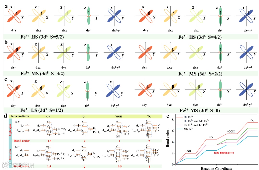 3d轨道电子填充分析HS铁物种往往比LS铁物种具有更高的亲电性,从而增强了与含氧中间体的吸附,这通常也会使随后的解吸更具挑战性。过强和过弱的键强度都会阻碍活性中心与氧中间体的同时吸附和脱离过程。根据键级分析,Fe3+的HS和Fe2+的MS的总键级值分别最大和最小。它们与含氧中间体的成键强度都不利于OER。在 *OH向*O 转化的过程中,LS(Fe2+ 和 Fe3+)的键级值与Fe2+的HS和Fe3+的MS相一致。在反应接近结束时(*O转变为*OOH),LS(Fe2+和Fe3+)的键级值相对于Fe2+的HS和Fe3+的MS较小,这表明它们更有利于*OOH解吸生成氧气(*OOH转变为*O2)。因此,含LS的FeWO-450 表现出最优异的OER性能。