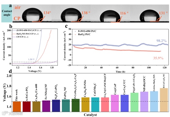 固-液-气三相亲水性测试结果表明,与纯碳纸相比,负载了FeWO-450 催化剂的碳纸的界面接触角降低了18°。结果表明,碳纸具有亲水性,有利于OER过程中的传质。FeWO-RT具有疏水性,而FeWO-650并没有显著改善亲水性。通过使用双电极系统将催化剂油墨涂在碳纸(CP)上,测试了 FeWO-450 催化剂的水氧化能力。双电极测试系统显示在10 mA cm-2时,FeWO-450/CP//Pt/C/CP的电压仅为1.50V,优于用商用贵金属催化剂组装的RuO2/CP//Pt/C/CP(1.52 V)和CP(1.82 V),并由于部分报道的催化材料。在1 M KOH溶液中,在1.53 V的电位下进行125小时的I-T测试后,电流密度仍保持在初始值的98.2%。