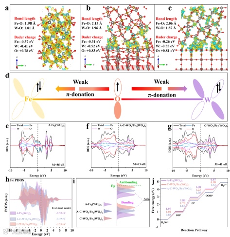 Fe获得电子会提高d波段中心的位置,从而增强其对含氧中间体的吸附能力。晶体C-WO3/Fe2(WO4)3中Fe的d带中心位置最高(-1.23 eV),因此对含氧中间产物的吸附能力最强。然而,正如上述自旋态分析结果所示,这不利于随后的解吸过程。为了进一步阐明自旋态变化对催化反应的影响,计算了不同结晶度的 FeW 氧化物的氧进化反应(OER)路径。结果表明,所有四个步骤都是内热过程。从*OH到*O的转化过程是一个速率决定步骤(RDS),其自由能(1.67 eV)在两种情况下都小于其他两种材料。这与所述的塔菲尔斜率和键序结果基本一致。同样,在*O向*OOH 的转化过程中,低自旋的 A-C-WO3/Fe2(WO4)3的反应自由能为1.05 eV,低于其他两种材料。因此,低结晶度(低自旋状态)的FeW 氧化物具有最高效的电子传导过程。