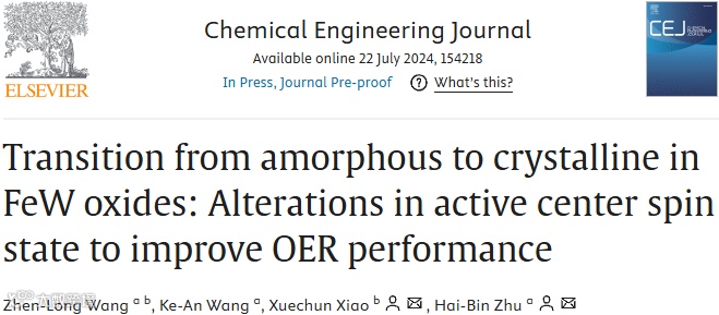 近日,来自东南大学的诸海滨团队与云南大学的肖雪春团队合作,在国际知名期刊Chem. Eng. J上发表题为“Transition from Amorphous to Crystalline in FeW Oxides: Alterations in Active Center Spin State to Improve OER Performance”的观点文章。该文章采用简单共沉淀方法制备的FeW氧化物,并通过高温处理对前驱体进行改性的催化材料,探究催化材料的结构、自旋态等因素与催化性能的关系。