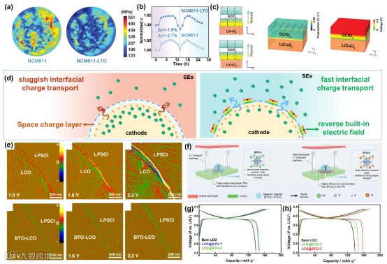 图4. (a)在最大应变状态下LiNi0.8Co0.1Mn0.1O2(NCM811)和 LiNi0.8Co0.1Mn0.1O2-LTO (NCM811-LTO)颗粒的拉应力分布。(b) NCM811和 NCM811-lTO 的晶格常数 c 的归一化演变。(c) GClO4涂层细胞变形示意图,其中 GClO4沿着一个方向拉伸并沿 b 方向压缩(左)。相场模拟铁电涂层中偶极子的取向和内置电场(中间和右边)的产生。(d)由空间电荷层(左)引起的全固态电池中缓慢的界面电荷输运,铁电效应促进界面处 Li+ 转移动力学的示意图(右)。(e)在1.0 V,1.6 V 和2.2 V 的偏压下,在 LiCoO2/Li6PS5Cl (LCO/LPSCl)和 BaTiO3-LiCoO2/Li6PS5Cl (BTO-LCO/LPSCl)界面上的净电荷密度积累的原位 DPCSTEM 观察。(f)顺电 BTO-C (左)和 STO-C (右)对界面 Li+输运的详细作用机制。LiCoO2/Li-In ASSBs 与 LCO 基阴极在30°C 的电化学性能。(g)在0.05C 的初始循环的电荷/放电特性。