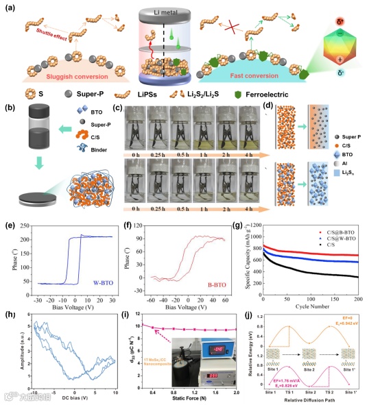 图3. (a)中间多硫化物在电化学过程中的溶解和穿梭行为以及铁电体对锂硫电池的屏蔽作用示意。(b) BTO + C/S 复合阴极合成工艺示意。(c)目视确认纯 S 阴极(上)和 S + BTO 阴极(下)在特定放电深度捕获多硫化物。(d)多硫化物在无(上)/有(下)极性 BTO 纳米颗粒的阴极内的作用示意。(e) W-BTO 和(f) B-BTO PFM 电滞回线; (g) C/S,C/S@W-BTO 和 C/S@B-BTO 电极的恒电流循环性能。(h 1T MoSe2纳米片的压电振幅响应。(1)1T MoSe2/CC 纳米复合材料的准静态压电系数 d33。(j)有/无耦合压电场时锌离子的能垒。