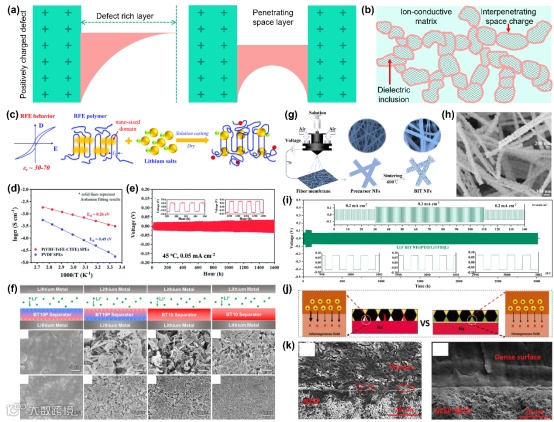 图6. (a)在大块和带正电缺陷(左)之间的界面上的损耗层,由于缺陷(右)的接近而穿透空间电荷层。(b)由穿透界面区域形成的导电通道。(c)具有高介电常数 εr 的 RFE 聚合物[例如P(VDF-TrFE)基三元共聚物]解离锂盐示意图。(d)P(VDF-TrFE-CTFE)和PVDF 固体颗粒在不同温度下的离子电导率。(e)Li/P(VDF-TrFE-CTFE)/Li电的镀锂/剥离循环的电压分布。(f)BT10P 分离器偏振方向对锂沉积形貌的影响。(g) BIT NFs的制备和晶体结构模型的程序。(h)BIT NFs的扫描电镜图像。(i)Li|5BIT NFs/PEO/LiTFSI|Li 对称电池的电压分布。(j)不同陶瓷电解质配对的固态金属电池中金属钠镀层的比较。(k) Na/NZSP-3BTO/Na和Na/NZSP-3BTO/Na细胞回收的金属Na的SEM图像。