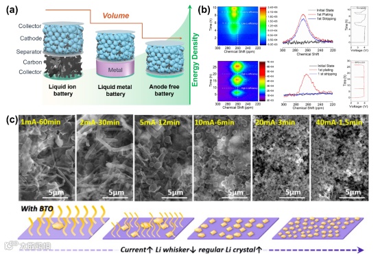 图8. (a)液体离子电池、液体金属电池和无阳极电池结构示意图。(b)裸Cu(上)和BTO包覆的Cu(下)基板上的 Li 金属镀/剥离的固态 NMR。(c)当电流密度从1mA cm-2增加到40mA cm-2时在含有 BTO 的衬底上的 Li 沉积物的 SEM 图像及提高电流密度时形态演变示意。