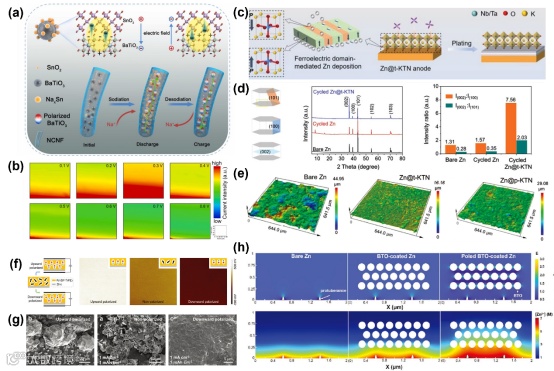 图7. (a) BTO对SnO2电极速率性能影响的机理解释。(b)不同电压下 SnO2/BTO@NCNF 电极的 SECM 面积扫描。(c)铁电畴介导的 Zn 沉积通过 t-KTN 的自发向上和向下极化抑制枝晶生长,调节 Zn 离子在铁电和 Zn 电极界面的分布。(d)循环100次后循环裸 Zn、 Zn@t-kTN 和 Zn@p-kTN 电极的 CLS光学图像。(e)六角Zn(左)的(101) ,(100)和(002)晶面的空间关系的示意图。裸锌、循环锌和循环锌@t-KTN 电极的 XRD 图谱(中)。(f)P (VDF-TrFE)涂层的极化过程及具有不同偶极方向P(VDF-TrFE)涂覆的锌阳极的 KPFM 图像。(g)沉积一定量的锌后涂覆向上/非/向下极化的P(VDF-TrFE)膜的锌金属阳极的形态演变。(h)裸锌电极、BTO镀锌电极和极化BTO镀锌电极的电场模拟(上)与浓度场模拟(下)。
