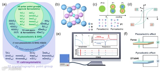 图2. (a)铁电、热释电和压电体之间的关系。(b) ABO3结构示意。(c)居里温度下顺电-铁电相变。(d)铁电体的 P-E 磁滞回线和相应的畴极化反转。(e)用于识别铁电体相变温度的光谱分析。(f)压电和热释电效应示意图。