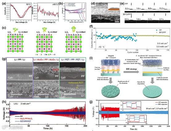 图5.(a)fBTO 和 nfBTO 粒子的局部 PFM 幅度-偏压曲线。(b)具有nfBTO/GO@CNT 中间层,fBTO/GO@CNT 中间层和原始分离器的电极的电荷/放电曲线。(c)nfBTO与Li2Sn结合能的结合几何和密度泛函计算。(d)BFO/PP分离器在铜表面的锂沉积形貌。(e)用液体电解质动态测量PP及 BFO/PP的接触角。(f -10℃的Li|Cu的循环性能。(g)循环后隔膜和锂箔的截面SEM图像。(h) PP,Al2O3/PP/Al2O3和PZT/PP/PZT分离的Li/Li对称细胞的循环性能。(i)隔膜双界面工程实现无锌枝晶策略。(j)对称锌电池镀锌/剥离稳定性。
