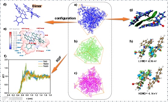Figure 2. MD simulation results of a) TA2O, b) TAO and c) TBAO; d) dimer structure of TA2O; e) ESP mapping of TA2O dimer; f) RDF mapping of three emitters; g) intermolecular interactions of TA2O dimer analyzed by independent gradient model based on interaction region indicator (IRI) method; h) calculated HOMO/LUMO distributions of TA2O dimer.