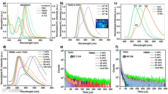 Figure 1. a) Normalized UV-vis absorption spectra of three emitters and acridone, and photoluminescence (PL) spectra of three emitters in dilute toluene solution (10-5 M); b) normalized PL spectra of TA2O in CHCl3 solution with different concentrations; c) normalized PL spectra of the target emitters in neat film fabricated by spin-coating; d) normalized PL spectra of TA2O doped in PMMA with various concentrations (fabricated by spin-coating); e-f) transient PL decays of TA2O doped in PMMA film with various concentrations.