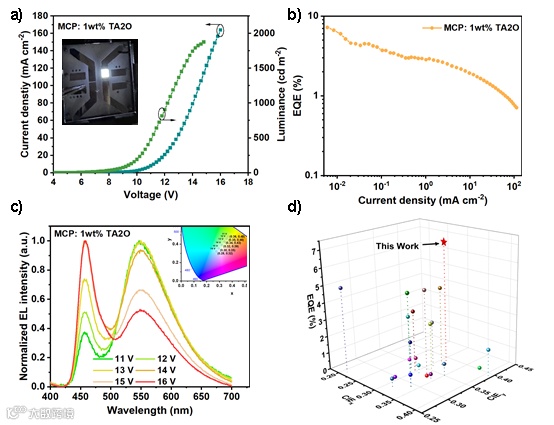 Figure 3. a) Current density-voltage-luminance (J-V-L), b) EQE-current density characteristics and c) EL spectra in different driving voltages of the fabricated WOLED device based on 1 wt% TA2O doped in MCP as the emission layer. d) Summary of the performance of representative purely organic single-molecule WOLEDs (CIEy < 0.40).