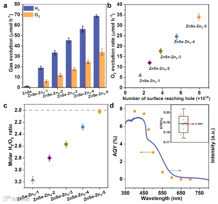 我们评估了ZnSe纳米线在无任何助催化剂的纯水中的全解水性能。最佳催化剂ZnSe-Znv-5纳米线的H2和O2产率分别为68.7 mol h-1和34.1 mol h-1,优于最近报道的大多数金属硫族化物光催化剂。此外发现ZnSe-Znv纳米线上产生的O2量随着到达光催化剂表面的空穴数的增加而增加。这些实验结果与计算结果吻合,即高Ea和低Ch+确实是ZnSe上OER反应的瓶颈。此外,ZnSe-Znv纳米线上的H2/O2摩尔比随着Znv浓度的增加而降低,最佳催化剂ZnSe-Znv-5纳米线的H2/O2摩尔比~2。