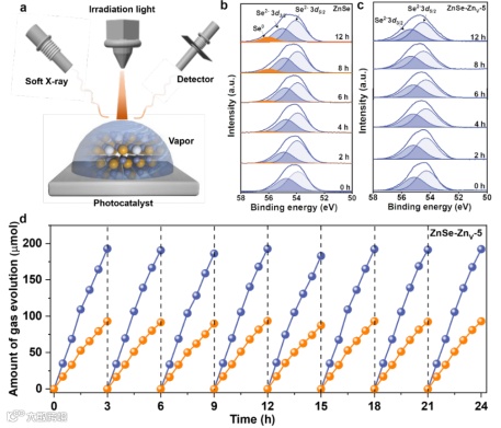 金属硫族化物光催化剂在全解水中面临的另一个关键挑战是空穴介导的光腐蚀问题。在本工作中,空穴在OER中的有利参与有望从根本上抑制关键的空穴介导光腐蚀。原位XPS测试结果表明,原始ZnSe光催化剂的Se 3d光谱随着反应的进行,逐渐出现了Se0氧化峰,而ZnSe-Znv-5纳米线的Se 3d XPS光谱几乎没有变化,证实了其有效的抑制了光腐蚀问题。