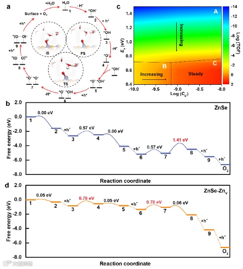 首先通过密度泛函理论计算和微观动力学研究了ZnSe催化剂表面上OER机制,并确定其速率决定步骤(O-O耦合),结果表明高反应能垒(Ea)和催化剂表面的低空穴浓度(Ch+)是限制OER反应动力学两大关键因素。这一发现解决了之前实验观察中的谜团,即单独引入OER助催化剂来降低Ea并不能显著促进金属硫族化合物光催化剂上的OER过程。此外,金属空位已被确定为半导体中空穴的捕获位点。因此,构造Znv有望同时降低Ea并增加Ch+,以促进ZnSe上的OER。