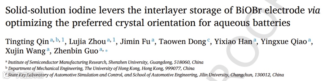 近日,深圳大学郭镇斌团队在国际知名期刊《Journal of Power Sources》上发表了题为“Solid -solution iodine levers the interlayer storage of BiOBr electrode vi a optimizing the preferred crystal orientation for aqueous batteries”的研究文章。该研究利用简单的溶剂热方法将碘元素固溶到BiOBr层间,增强了优选的(110)晶面取向,这些晶面作为离子扩散通道的直接入口,并增强了与OH−的相互作用,从而优化了层间空间的利用。另一方面,固溶碘还有助于加速电荷转移动力学。这项工作提升了层状材料的层间储存能力,为最大化电荷存储和反应动力学中的层间空间利用提供了一个新的范式。