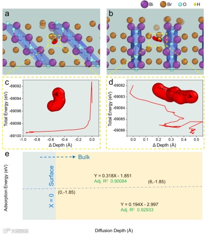 要点二:在BiOBr的(102)和(110)择优晶面中,OH−展现出不同的扩散路径和扩散行为。OH-在择优的(102)晶面基体中,OH−离子的扩散深度浅,且趋向于向表面扩散;而在择优的(110)晶面基体中,OH−离子的扩散深度深,且趋向于向体相扩散。这表明(110)晶面取向的BiOBr对于开发BiOBr的层空间存储更有效。