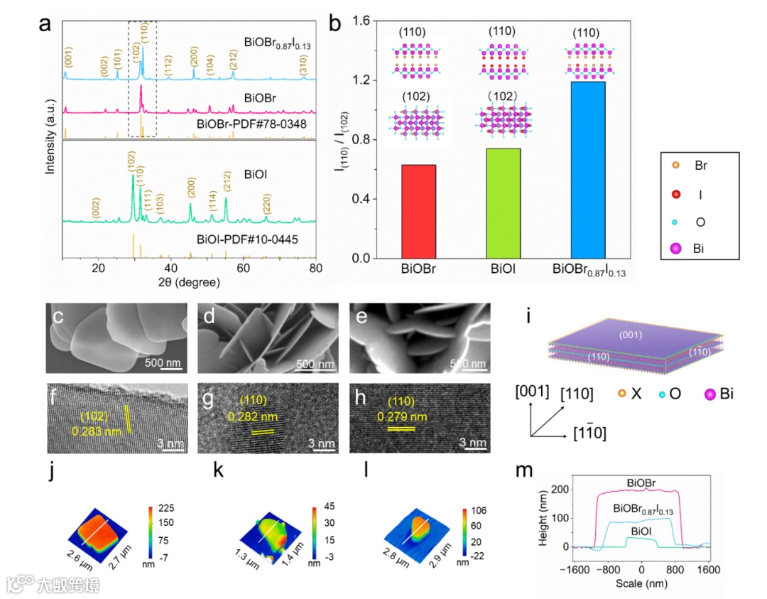 图一:BiOBr, BiOI and BiOBr0.87I0.13电极的结构表征。