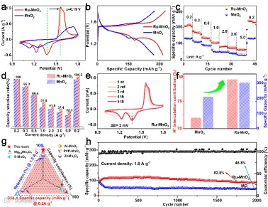 测试对比了Ru-MnO₂和MnO2正极材料的循环伏安(CV)曲线、恒流充放电(GCD)曲线、倍率性能和循环稳定性,结果证明,Ru-MnO₂电极材料在用于水系锌离子电池中,展现优越性能。