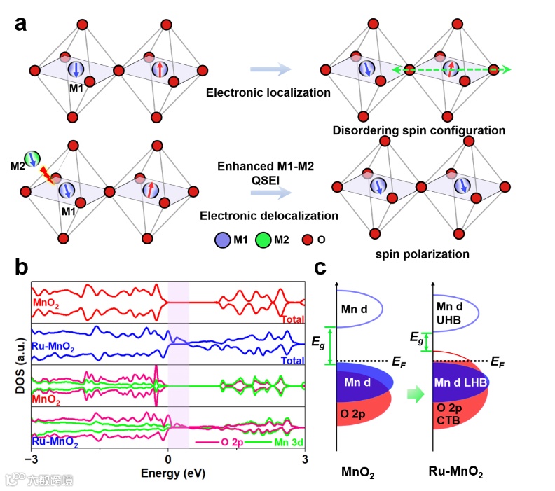 通过引入Ru掺杂,探讨了量子自旋交换相互作用(QSEI)与电化学性能之间的关联。研究表明,Ru与Mn原子之间的强耦合显著增强了QSEI,进而引发显著的自旋极化和电子离域。密度泛函理论(DFT)计算结果表明,Ru-MnO₂的总态密度(TDOS)呈现出不对称的自旋电子分布,伴随O p带的展宽,导致带隙缩小并改善了电子传输性能。理论研究表明,这种通过调控QSEI实现的电子结构优化,有助于提高锌离子电池的电化学性能。