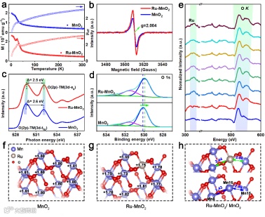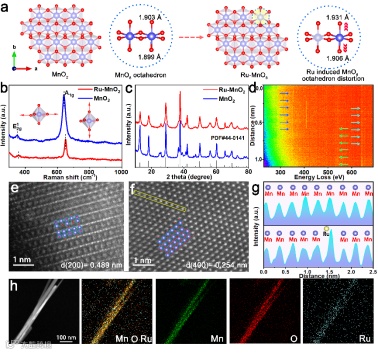 该研究通过一步水热法合成了Ru掺杂的MnO₂电极材料并通过DFT计算、Raman、 XPS与EELS等技术表征了材料的晶体结构、元素组成和形貌特征。