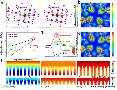 通过DFT计算和流体动力学模拟,进一步揭示该材料的储能机理。结果证明,Ru-MnO₂中自旋交换相互作用是反应动力学增强的本质原因。COHP和吸附能分析显示,Ru-MnO₂中的O p带显著展宽,有助于增强材料中的电子导电性,降低质子吸附能,从而提升H⁺插层效率。