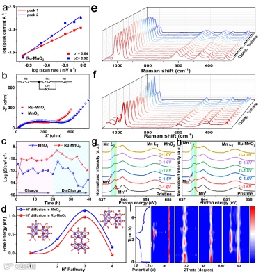 进一步结合原位拉曼测试,原位XRD测试以及类原位sXAS等测试,深入探究所制备的Ru-MnO₂电极在充放电循环中的结构和形态演变。阐明了Zn/MnO2电池的电荷存储机制,并对其稳定性进行了评估。结果表明,Ru-MnO₂在优化电荷转移动力学方面具有独特的优势。
