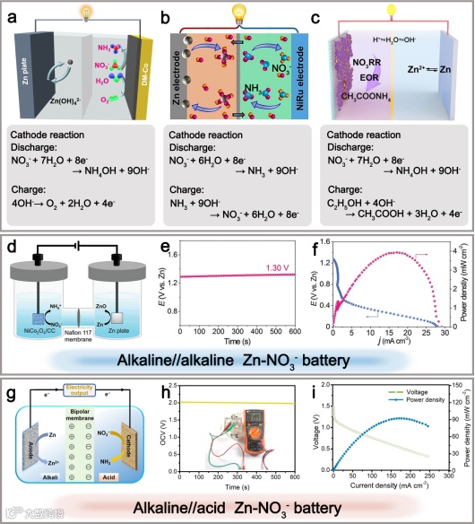 图2. 不同电极反应和不同电解液的Zn-NO3-电池。