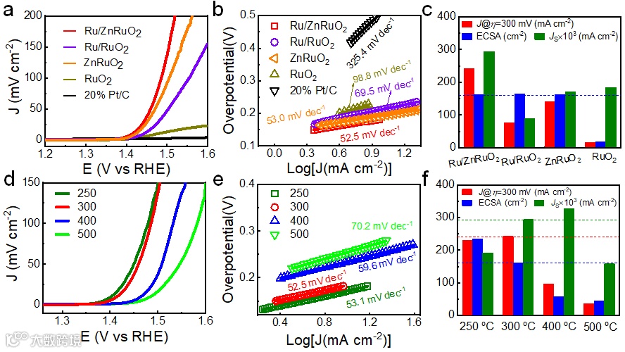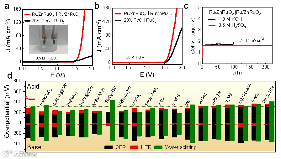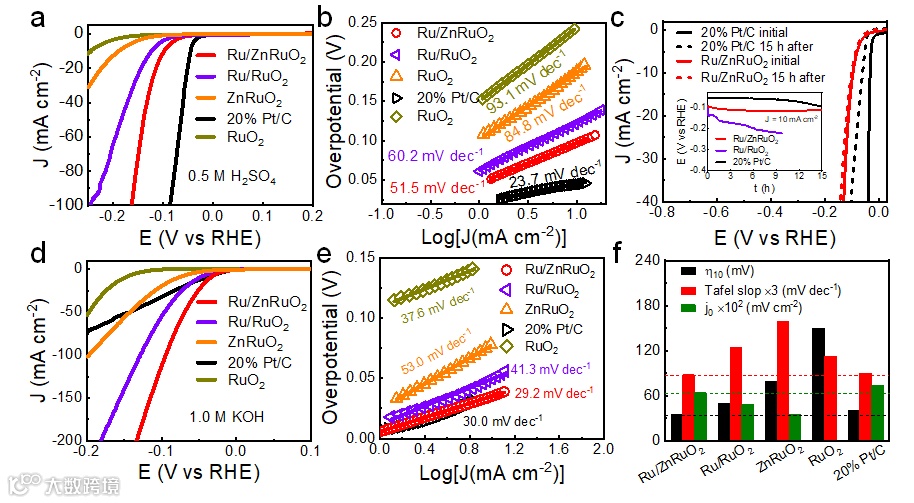 由于Ru/ZnRuO2独特的结构和高比表面积,所制备的Ru/ZnRuO2具有高的本征活性和丰富的活性位点。Ru/ZnRuO2 在 10 mA cm-2 下表现出低过电势,在 0.5 M H2SO4 中的 OER 为 184 mV,在 1.0 M KOH 中的 HER 为 35 mV,优于大多数已报道的电催化剂。更重要的是,Ru/ZnRuO2 可用作高效双功能电催化剂,用于酸性和碱性介质中的全水分解,电解电压分别为 1.540 和 1.567 V(10 mA cm-2),并且具有长期耐久性,可分别工作220和100小时以上。