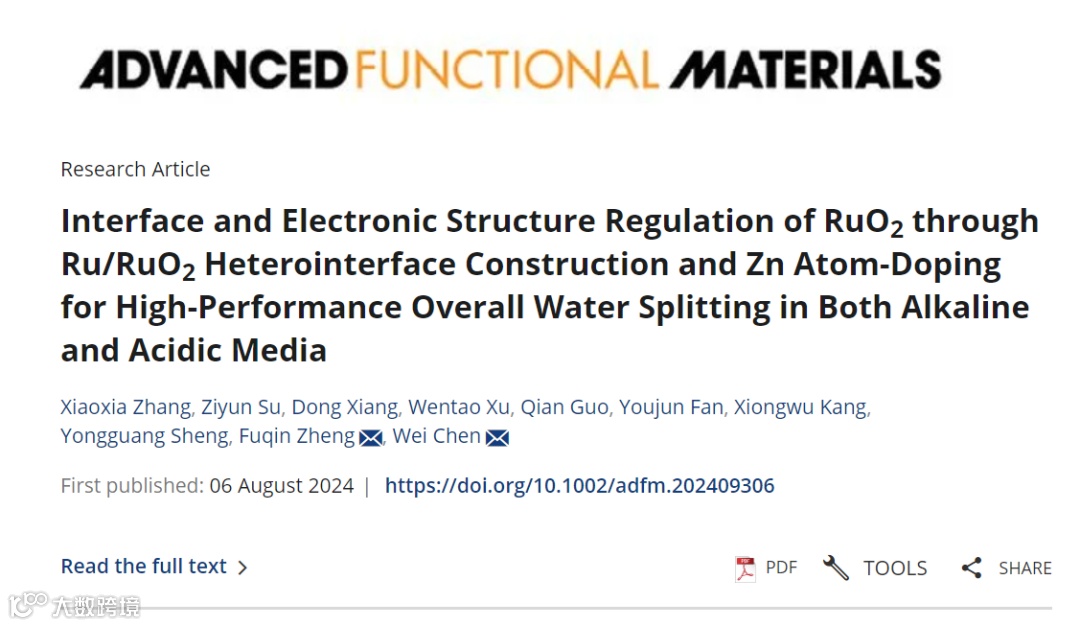 基于此,陈卫教授和郑伏琴副教授在国际知名期刊AFM上发表题为“Interface and Electronic Structure Regulation of RuO2through Ru/RuO2Heterointerface Construction and Zn Atom-Doping for High-Performance Overall Water Splitting in Both Alkaline and Acidic Media”的文章。