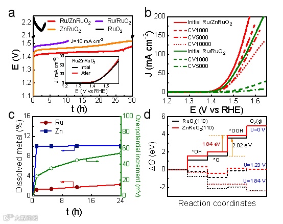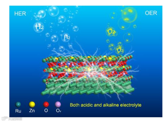 通过 Ru/RuO2 异质界面构建和锌原子掺杂调控RuO2的界面和电子结构,实现在碱性和酸性介质中的高性能全水分解