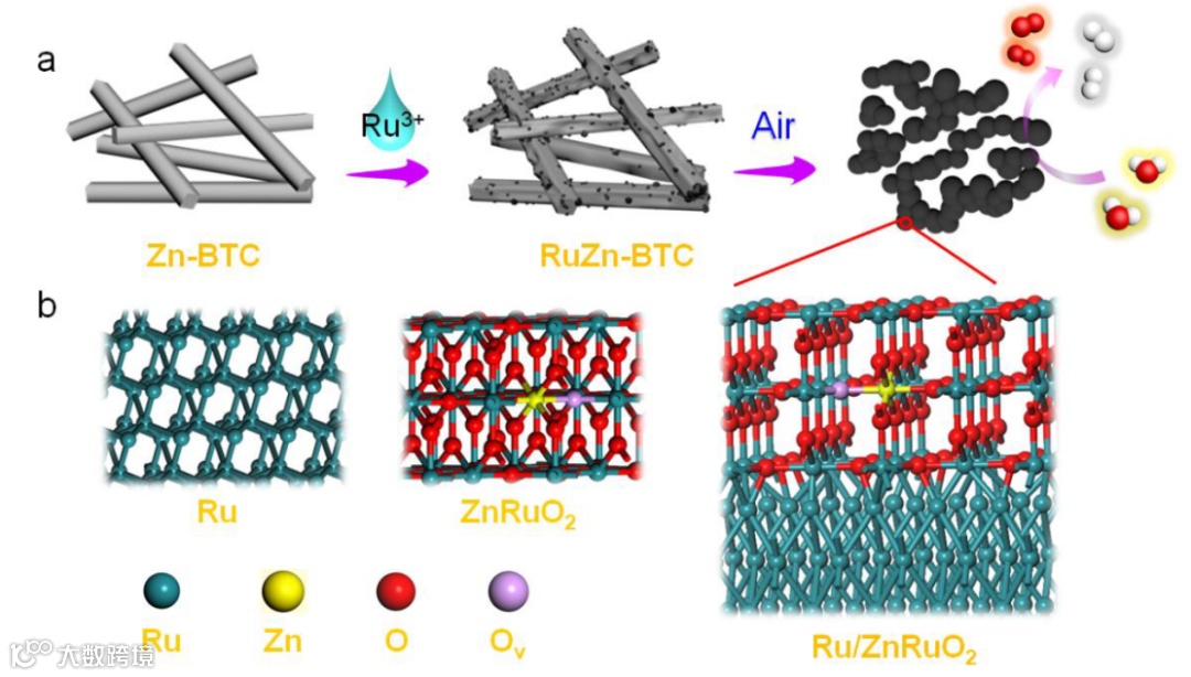 在所有Pt替代催化剂中,RuO2是特别适用于酸性介质中 OER 的优异电催化剂之一,其价格相对较低(Pt 成本的二十分之一)、且具有较高的氧结合能力和稳定性, 甚至优于IrO2。然而,由于RuO2容易氧化成较高价的RuO4,从而溶解在强腐蚀电解液中,其活性和耐久性距离应用还很远。本文基于对RuO2催化剂进行合理改性构建,通过引入Ru/RuO2异质界面和杂原子Zn,调控 RuO2的界面和电子结构,实现在碱性和酸性介质中的高性能全水分解。
