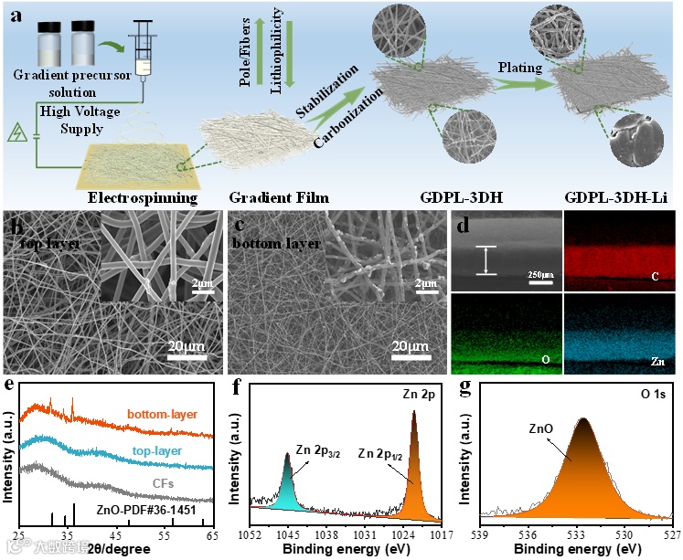 制备得到的GDPL-3DH具有自上而下递减的梯度孔隙结构(孔径/纤维尺寸)和递增的亲锂活性位点(ZnO)。顶部的大孔径增强了Li+自上而下的扩散,缓解了Li+沿深度方向自发形成的浓度梯度。而在预锂化过程中,从顶部到底部的亲锂性ZnO梯度增加,转化为Li-Zn合金和Li2O,诱导Li+在底部均匀沉积。二者协同作用下促进Li+优先且均匀地沉积在底部而不是顶部表面,呈现“自下而上”的沉积模式,显著抑制了Li枝晶的生长,缓解Li负极的体积变化,提高寄主的空间利用率(如图2所示)。