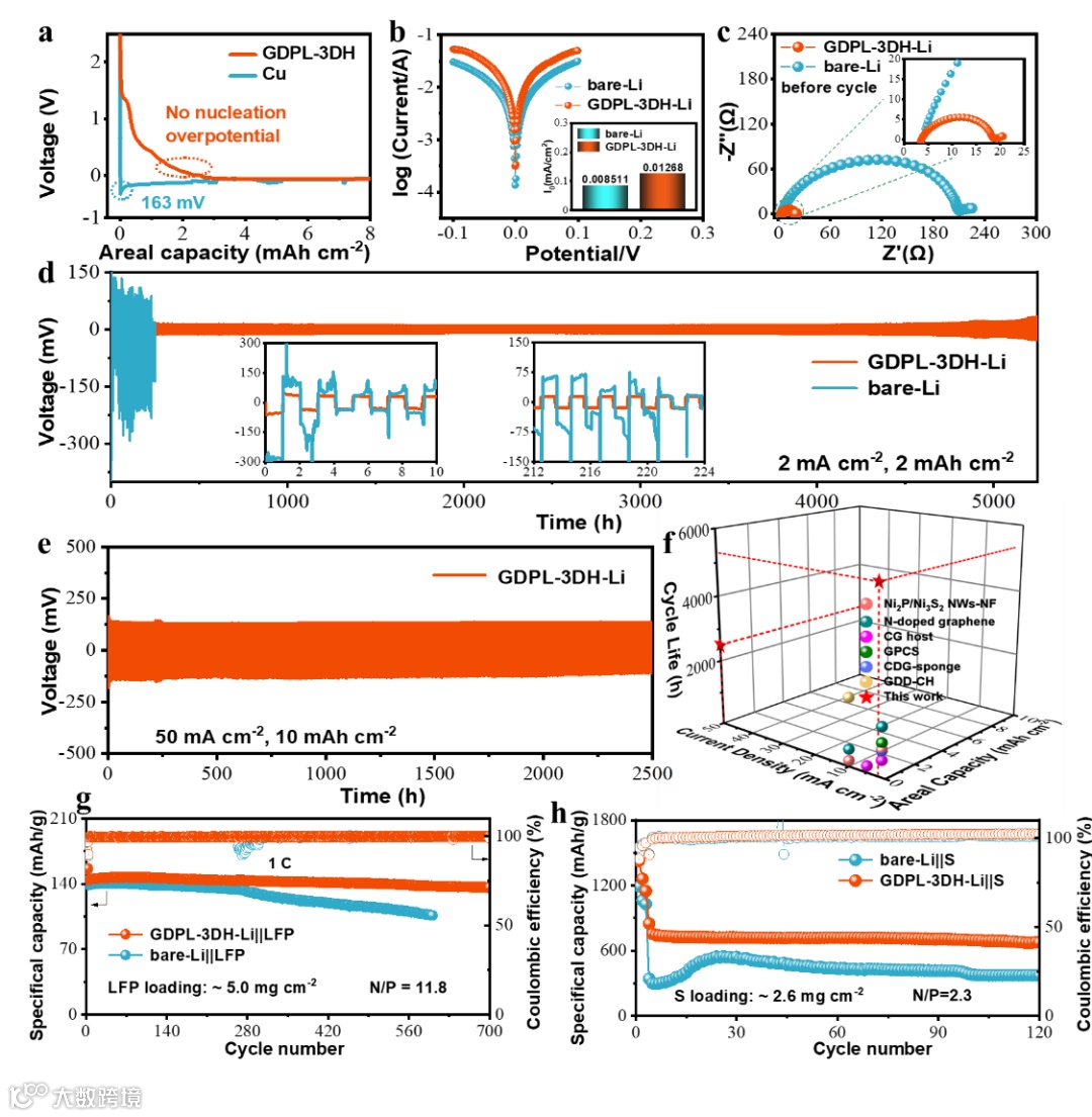 基于以上优点,以GDPL-3DH-Li负极组装的对称电池能够以较低的极化电压(<17 mV),稳定循环超过5250 h,在50 mA cm-2的超高电流密度下仍然具有2500 h的长寿命。此外,以GDPL-3DH-Li负极组装的全电池具有优异的电化学性能,与LiFePO4匹配组装的全电池时经过700次循环后仍能保持136.8 mAh g-1的高可逆容量,容量保持率高达94.7%。同时,该GDPL-3DH-Li电极与S/C正极组装的全电池的比容量和循环性能也明显得到提升(如图3所示)。