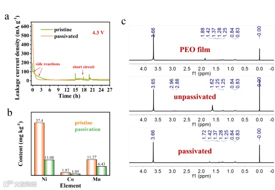 图4. (a) 钝化前后NCM811||PEO||Li的电流-时间曲线; (b) PEO电解质中Ni, Co, Mn含量的ICP-MS结果; (c)不同电池 10次循环后PEO电解质的1H NMR。