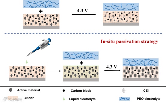 图1. 原位策略示意图。在4.3 V的电压下,PEO容易被NCM811催化分解,通过牺牲微量液体电解液形成CEI层可以避免这些反应。