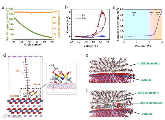 图2. (a) 0.2 C电流密度下NCM||PEO||Li电池的循环性能; (b) NCM|| PEO|| Li电池在0.1 mV s-1下的CV曲线; (c) Al||PEO||Li电池的LSV曲线,扫速为10 mV s-1;(d) NCM表面PEO固态电解质的分解机理; NCM和PEO (e)与液体电解液 (f) 的分子动力学模拟。