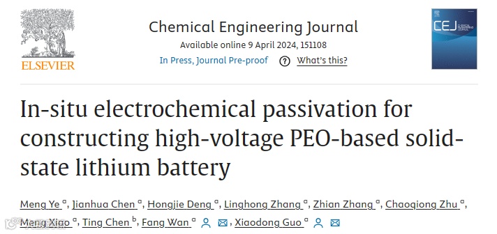 近日,来自四川大学的郭孝东教授和万放研究员团队,在国际知名期刊Chemical Engineering Journal上发表题为”In-situ electrochemical passivation for constructing high-voltage PEO-based solid-state lithium battery”的研究论文。该论文提出一种原位电化学钝化策略来构建耐高压PEO基固态电池。通过在LiNi0.8Co0.1Mn0.1O2 (NCM811)电极表面滴加微量液态电解液,液态电解液在电化学过程中先于PEO固态电解被分解。电解液分解生成的CEI膜附着在正极表面,避免了PEO与NCM811的直接接触,从而保护PEO在高压下不被NCM811分解。