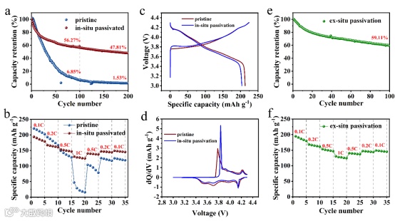 图5. 未钝化电池和原位钝化电池的 (a) 0.1 C下的循环性能,(b)倍率性能,(c)首圈充放电曲线和 (d) dQ/dV曲;非原位钝化电池0.1 C下的循环性能 (e) 和的倍率性能 (f) 。
