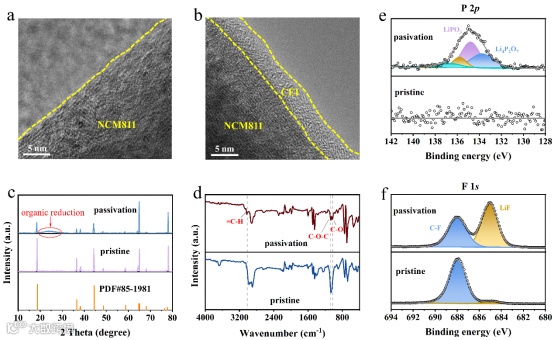 图3. NCM811电极钝化前 (a) 和钝化后 (b) 的TEM; (c) NCM811电极的XRD和FTIR; NCM811电极的 (e) P 2p和 (f) F 1s的XP。