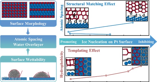 在冰成核过程中,由于Pt与水的强烈相互作用,在Pt表面形成了水覆盖层。覆盖层呈六边形结构,可以作为其上方冰层形成的模板,即模板效应。当Pt表面原子间距与冰晶的特征距离相近时,Pt表面的冰成核明显加快,称为结构匹配效应。模板效应和结构匹配在冰成核过程中起着重要作用。通过调整Pt的晶面可以改变原子间距。Pt(211)表面较大的原子间距和无序的水覆盖层减轻了结构匹配和模板效应,导致较大的成核能垒,可以有效地抑制Pt(211)表面的结冰。