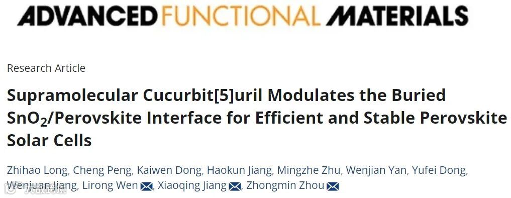 基于此,来自青岛科技大学的周忠敏教授在国际知名期刊Advanced Functional Materials上发表题为“Supramolecular Cucurbit[5]uril Modulates the Buried SnO2/Perovskite Interface for Efficient and Stable Perovskite Solar Cells”的观点文章。该文章使用一种大分子葫芦脲[5]掺入SnO2电子传输层以实现对电子传输层和钙钛矿埋底界面的双重钝化,同时对掺杂前后的器件性能和稳定性进行了各种表征,掺杂后的器件性能相比对照组有明显的提升。