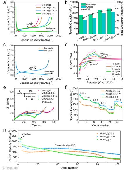 图5. (a) 样品的电压分布图和 (b) 比容量和ICE。(c) M-SiOx@C-0.75的第二次和第三次循环的电压曲线和 (d) CV曲线。(e)奈奎斯特图。(f) M-SiOx@C-R的倍率性能和 (g) 循环性能。
