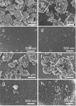 图3. (a, c) p-SiO@C,(b, d) M-SiOx@C-0.5,(e, g) M-SiOx@C-0.75和(f, h) M-SiOx@C-1在不同放大倍数下的SEM图像。
